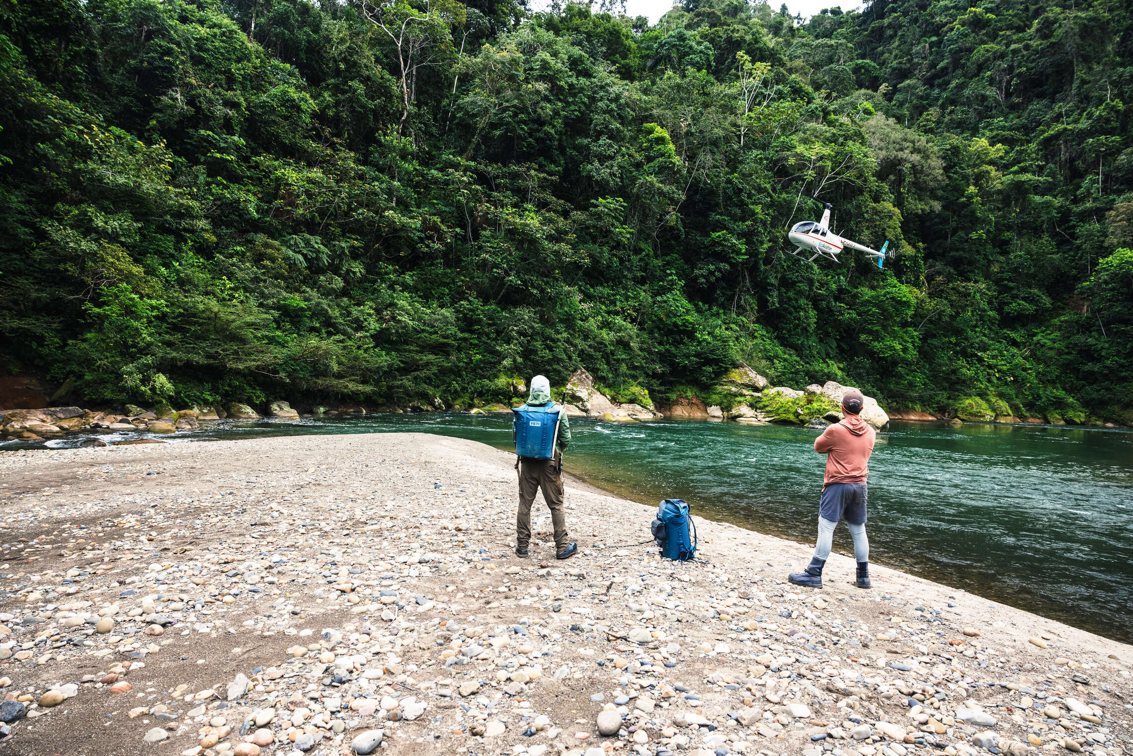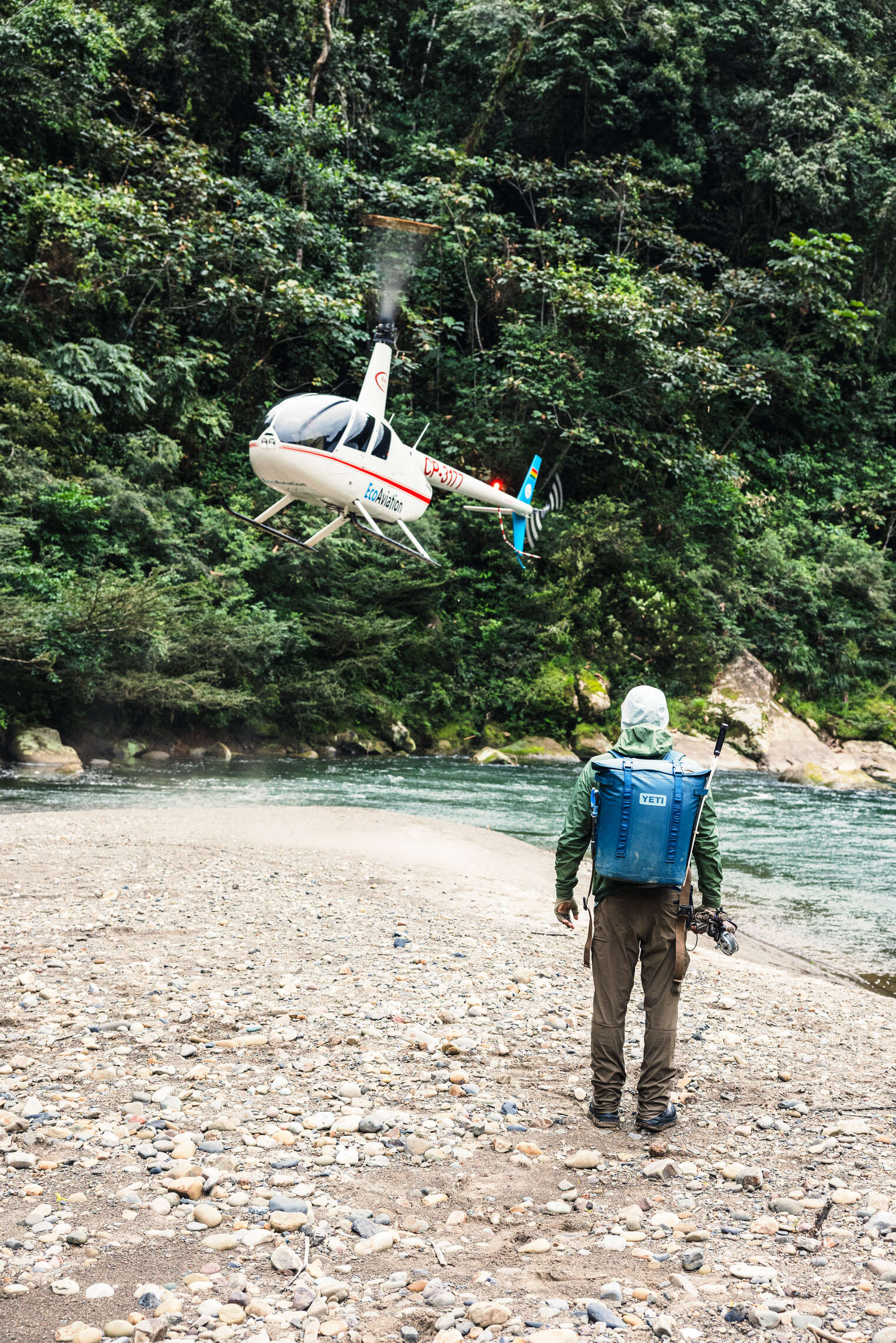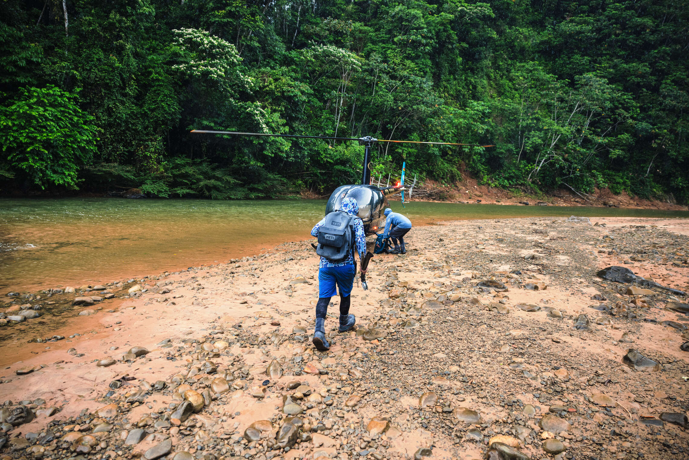 First impressions of any fishing trip involving helicopters to access remote rivers always conjure up an image of convenience and ease. While counterintuitive, the heli fishing in Bolivia program is actually a LOT more work than their sister programs at the “regular” lodges that utilize the mobility of dugout canoes. Two anglers and a guide are dropped on a sandbar at spot X and scheduled to pick up at spot Y upstream several hours later. While the guides carry Garmin InReach devices and can call an audible as needed, for the most part, you are fishing 2-4 kilometers of a river beat each day. This involves walking and wading rough rocky (slippery) terrain, climbing boulders, locking arms in rapids, machete-ing your way through Bolivian jungle fly fishing terrain, and often swimming deep pools. Jason Petty’s record day was 26,000+ steps! It is worth getting into shape for this trip for sure, and if you do not do well with bugs this trip is not for you!