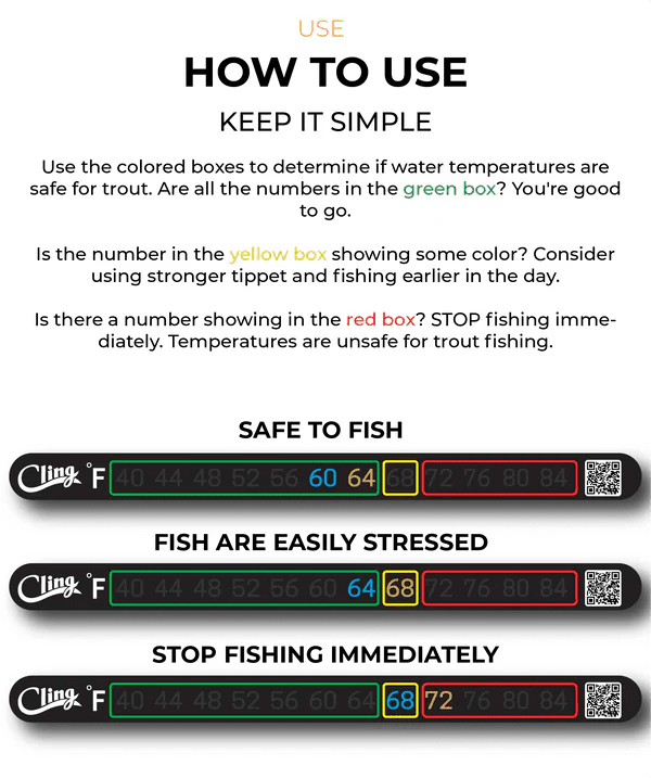 Never guess what the water temperature is with temperature tape. This thermometer securely fastens to your fishing net or any other smooth surface and tells you the exact water temperature within 1-2 degrees. This thermometer also features a "safe zone" outlined in green, a "warning zone" outlined in yellow, and a "danger zone" outlined in red to ensure the user is aware of when the water temps are safe for trout and when they're not! Easy to read and Easy to use this thermometer is sure to keep the trout safe.