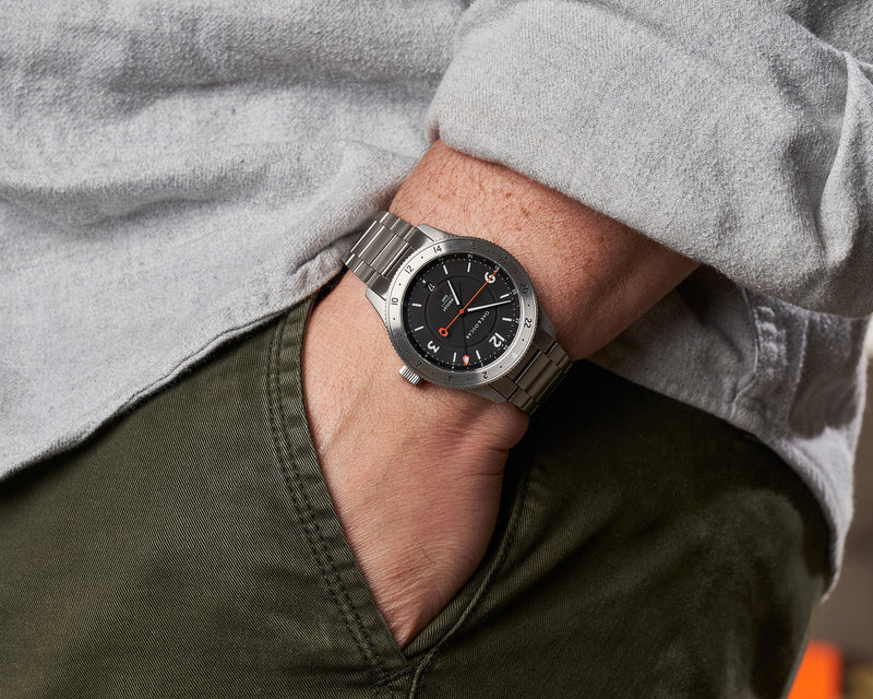 The anti-fragile, anti-worry, go anywhere and do anything watch. Swiss-powered, anti-shock, anti-magnetic, GMT function all in a brushed stainless steel 40mm case with a bi-directional bezel and 20ATM water resistance. Built to Discover.